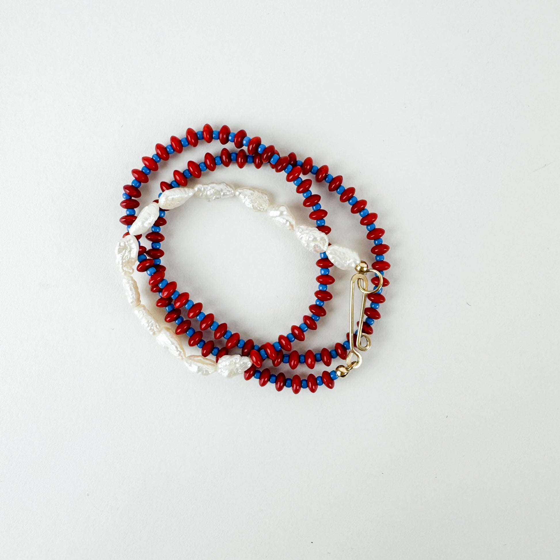 The Alber Necklace is simple, elegant, and sophisticated. Red coral alternates with bright blue Japanese seed beads and is asymmetrically offset by freshwater pearls.