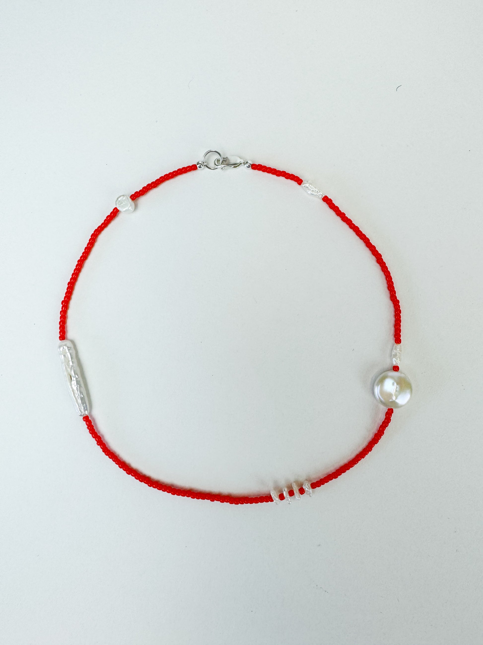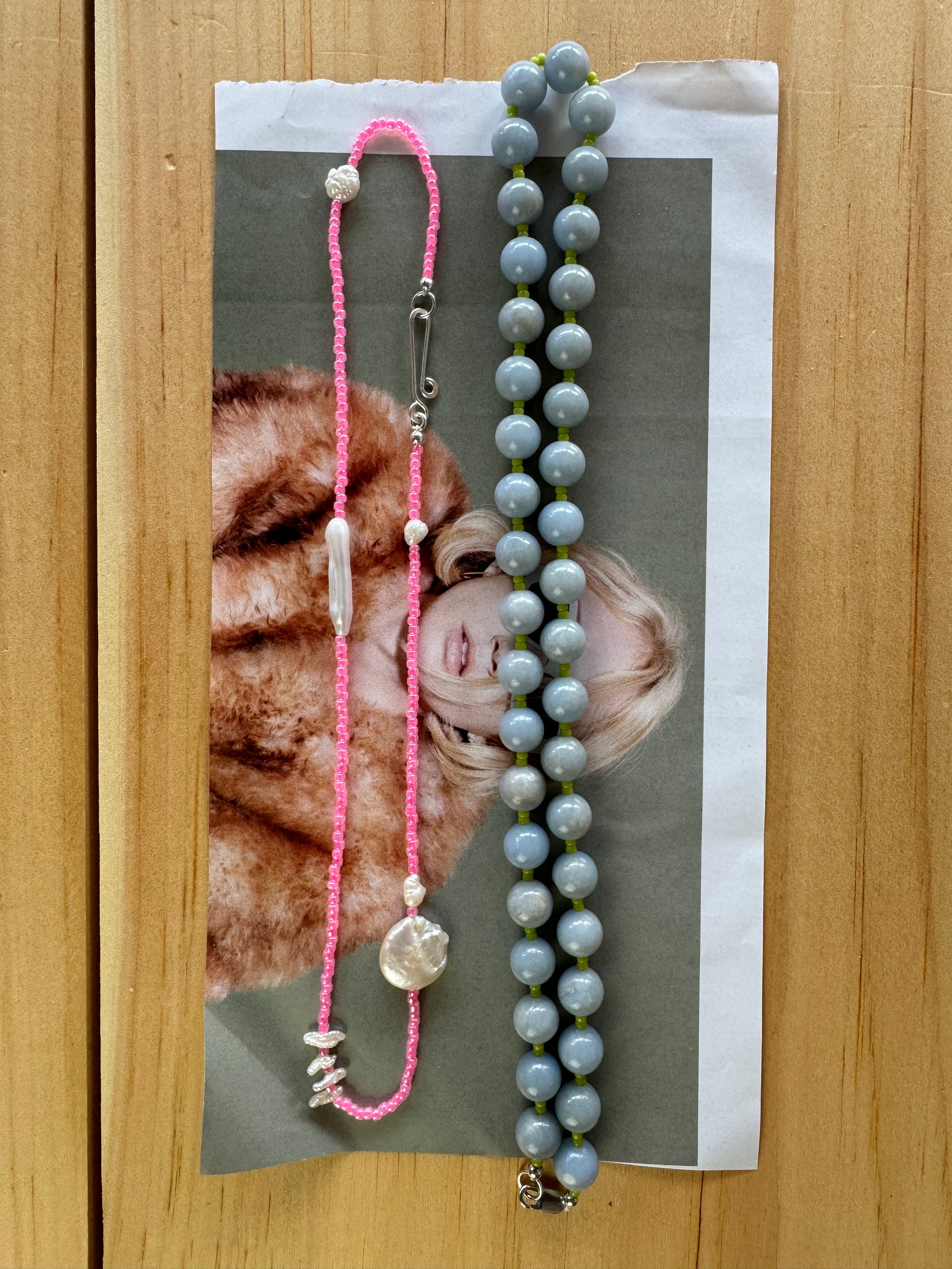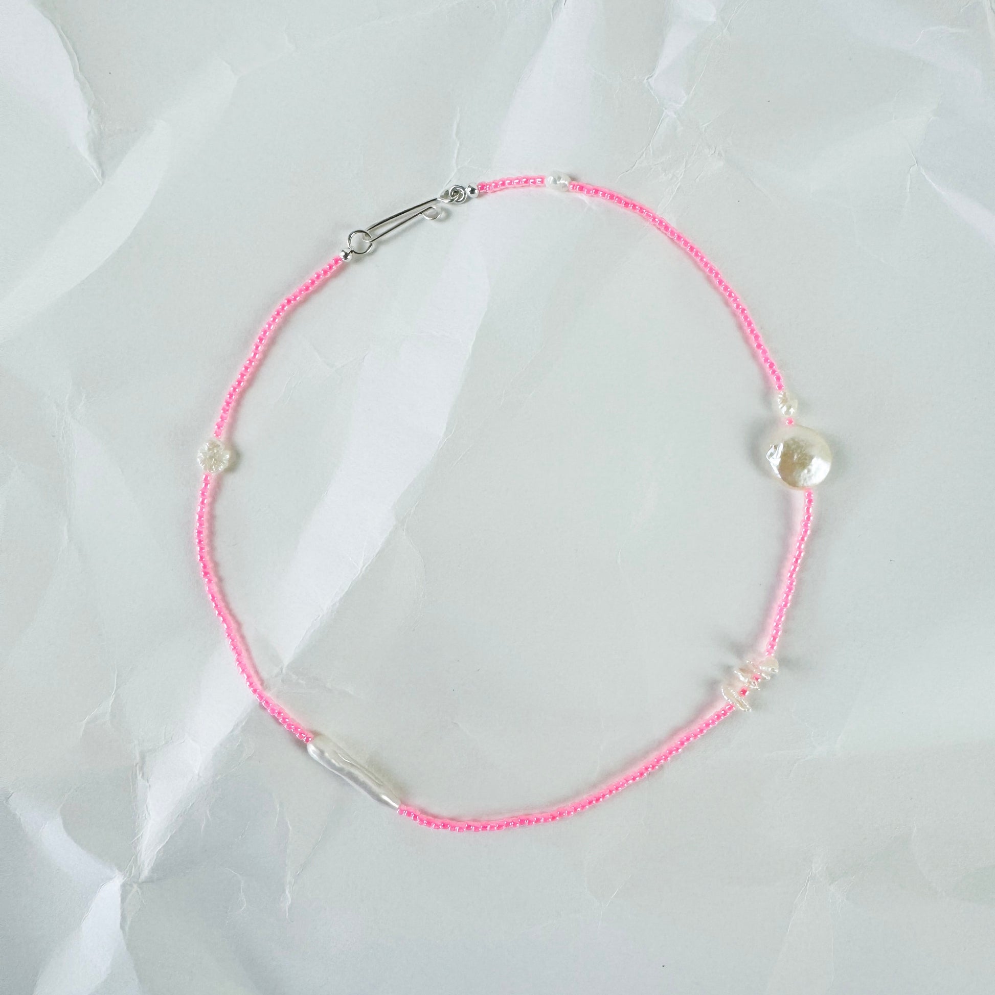 Japanese glass seed beads with freshwater pearls. Strung on silk, complete with metal clasp. Each piece comes with a hand sewn fabric pouch and gift box for safekeeping.