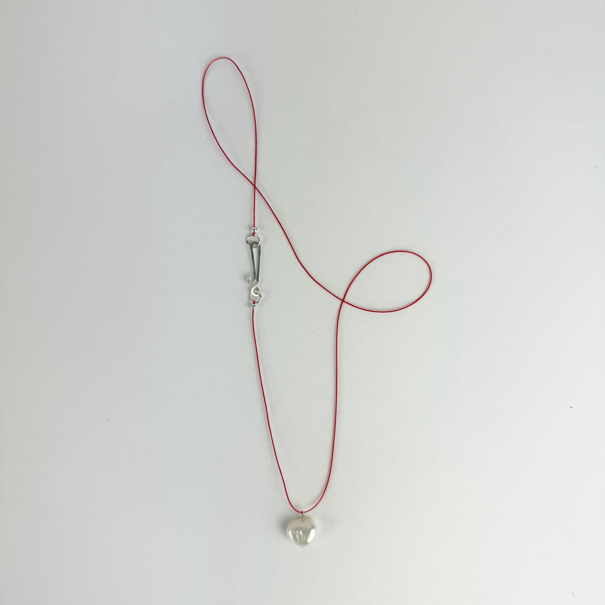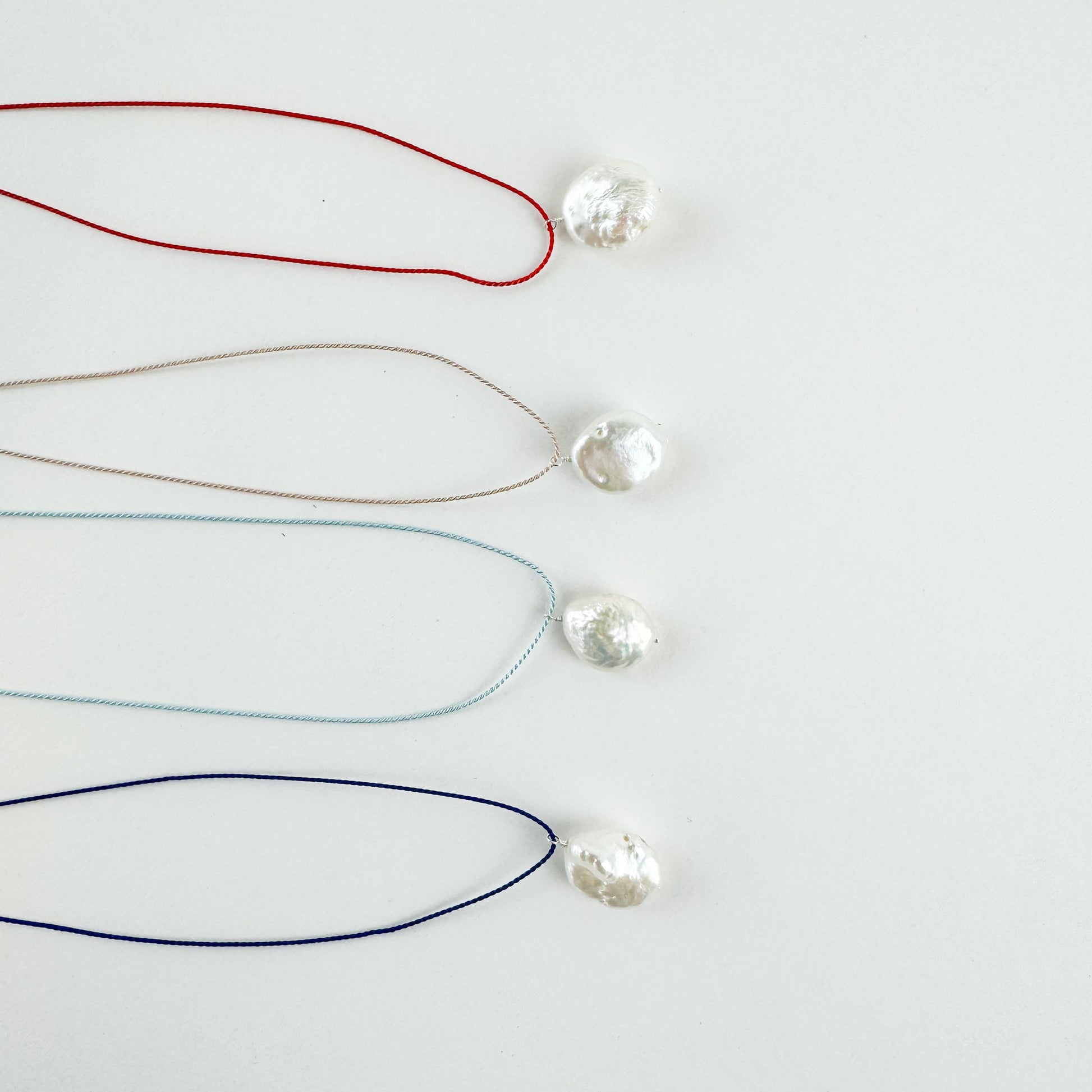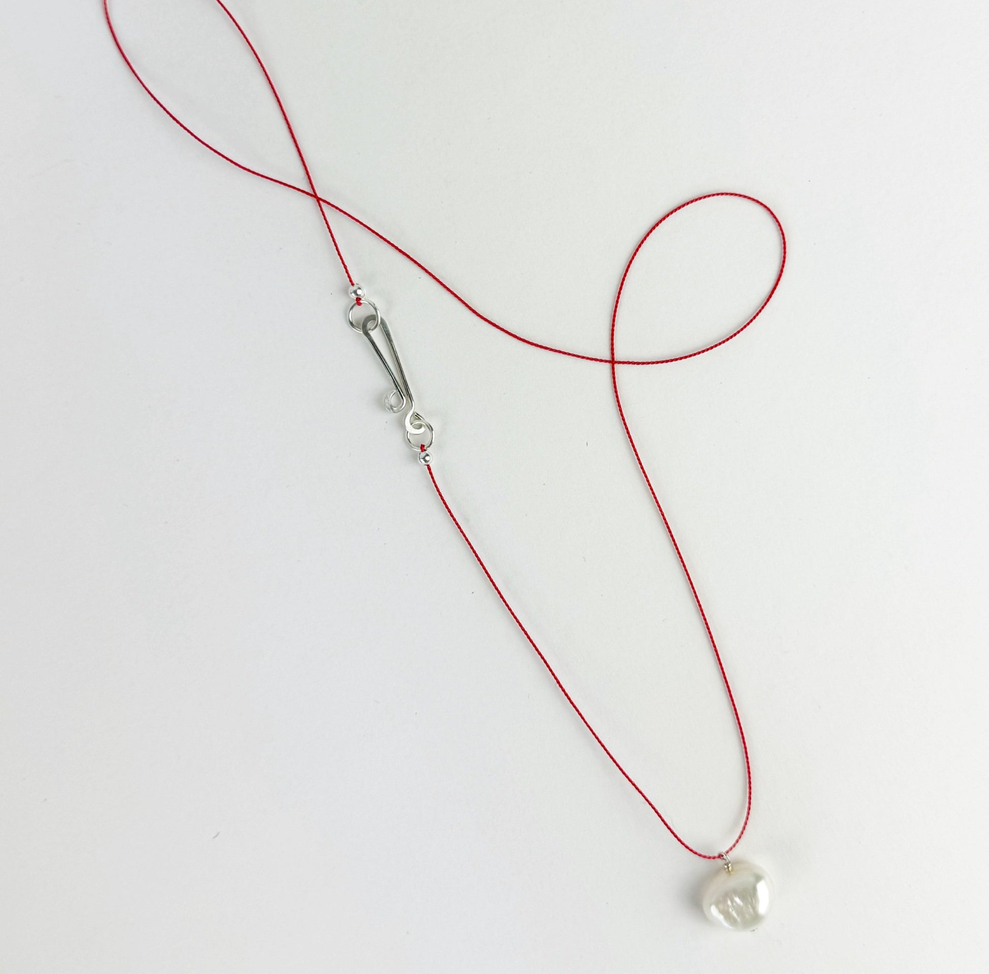 Red is the color of the Hindu Goddess Durga. She represents feminine power, vanquished evils and new beginnings. Freshwater coin Pearl on Silk thread.