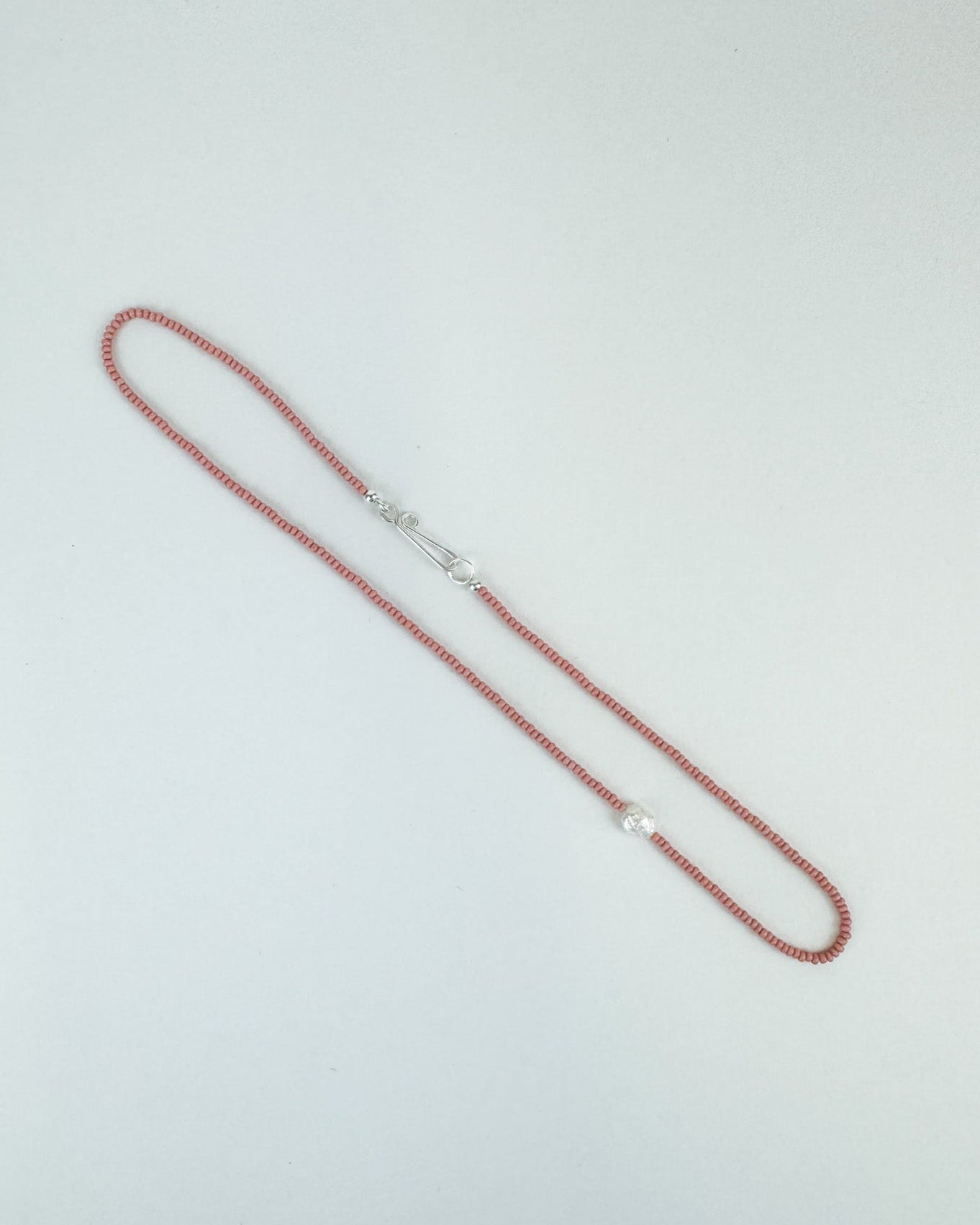 A single freshwater pearl strung with silk and offset by Japanese seed beads.