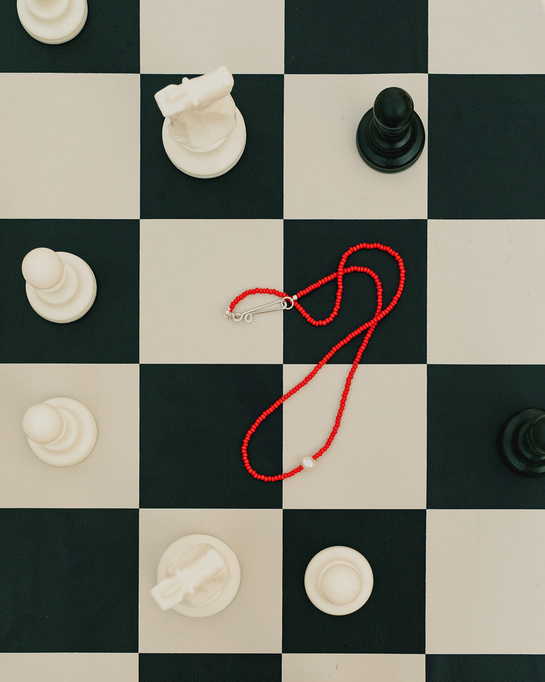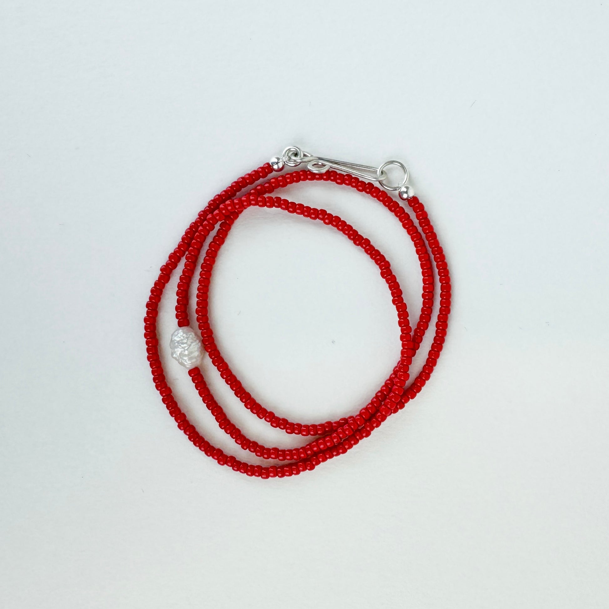 A single freshwater pearl strung with silk and offset by Japanese seed beads.