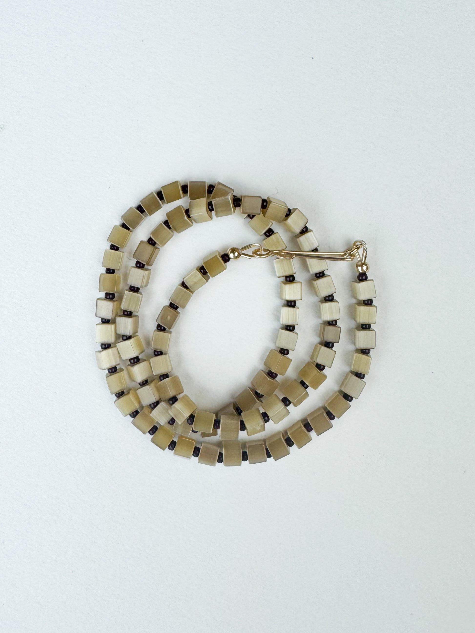 Optic Glass cubes with alternating chocolate brobe Japanese glass seed beads. Strung on silk, complete metal clasp. Each piece comes with a hand sewn fabric pouch and gift box for safekeeping.