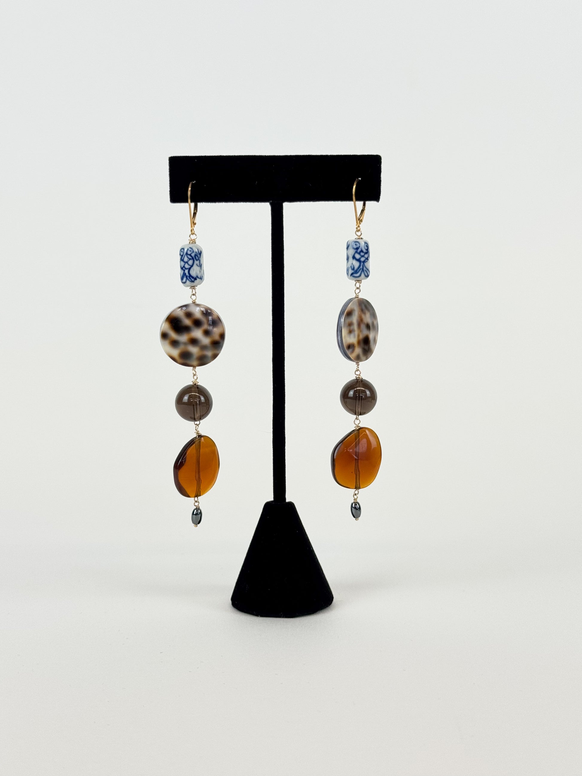 14K Gold-Fill, Porcelain, Tiger Cowrie Shell, Smoke Quartz, Hematite.